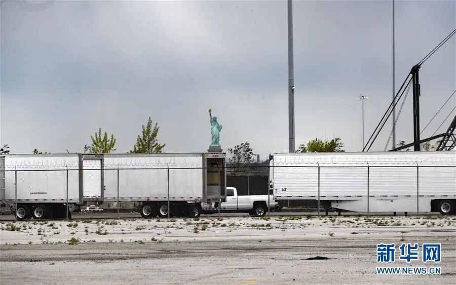 5月11日,冷藏车停放在美国纽约布鲁克林一处新开辟的临时停尸场所内。美国约翰斯·霍普金斯大学11日发布的新冠疫情最新统计数据显示,美国累计死亡病例超过8万例。新华社记者 王迎 摄