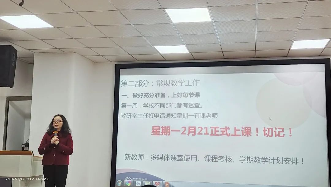 蔡小葵副院长安排部署了新学期各项教学工作安排教学常规工作及教学重点工作,强调了相关注意事项。号召全体教师在新学年要以更加饱满的激情投入到课堂教学和“三教”改革当中,重点要做好思政课示范课堂建设、精品在线开放课程建设、教学能力比赛以及线上线下混合式教学模式探索创新等工作。