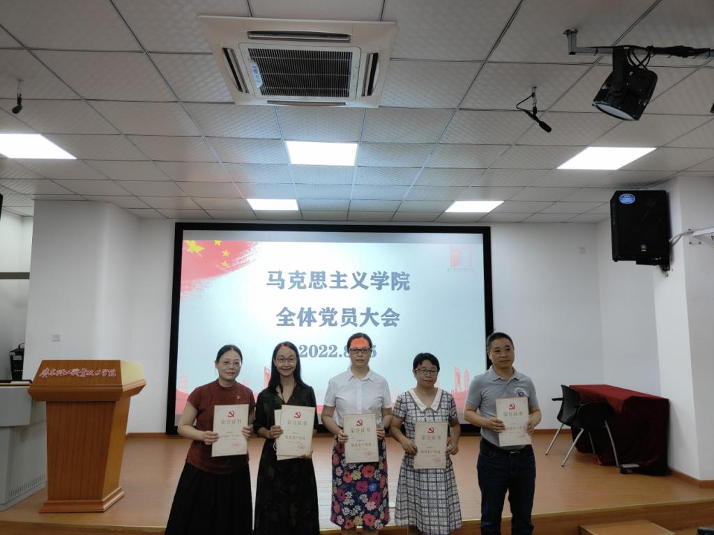 党员大会上,党总支对今年学校“七一”表彰中获评的先进党支部:概论课党支部、优秀党务工作者丁玲、优秀共产党员蔡小葵、高顺起、陈爱华、叶彦岑、学习强国学习标兵丁玲、叶彦岑、余展洪等进行了集体颁奖。