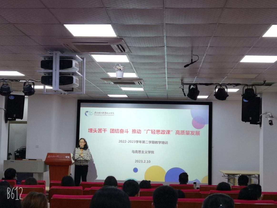 蔡小葵副院长以“埋头苦干 团结奋斗 推动广轻思政课高质量发展”为主题,部署新学期工作及做了业务培训。分别从上学期教学方面标志性成果、日常工作、新学期专项工作、省教育厅和学校新学期重点工作等七方面对回顾上学期工作及对新学期工作做了详细布置。特别指出重点要做好思政课示范课堂建设、教学能力比赛、课堂革命等工作。重点对如何撰写“课堂革命”典型案例做了专门的业务培训。希望马院全体教师在新的学年继续深化“三教”改革,推动课堂革命,提升课堂教学质量。