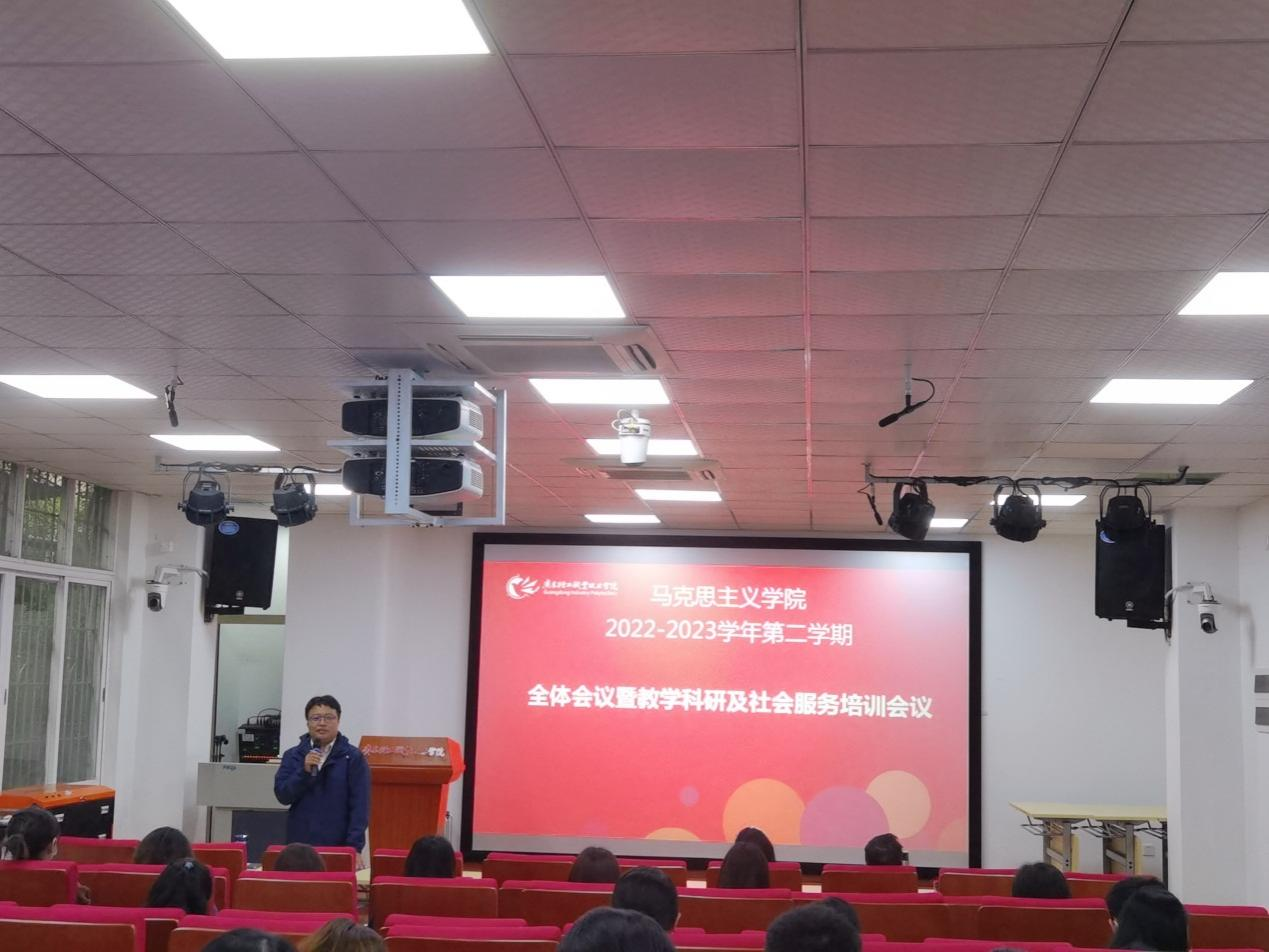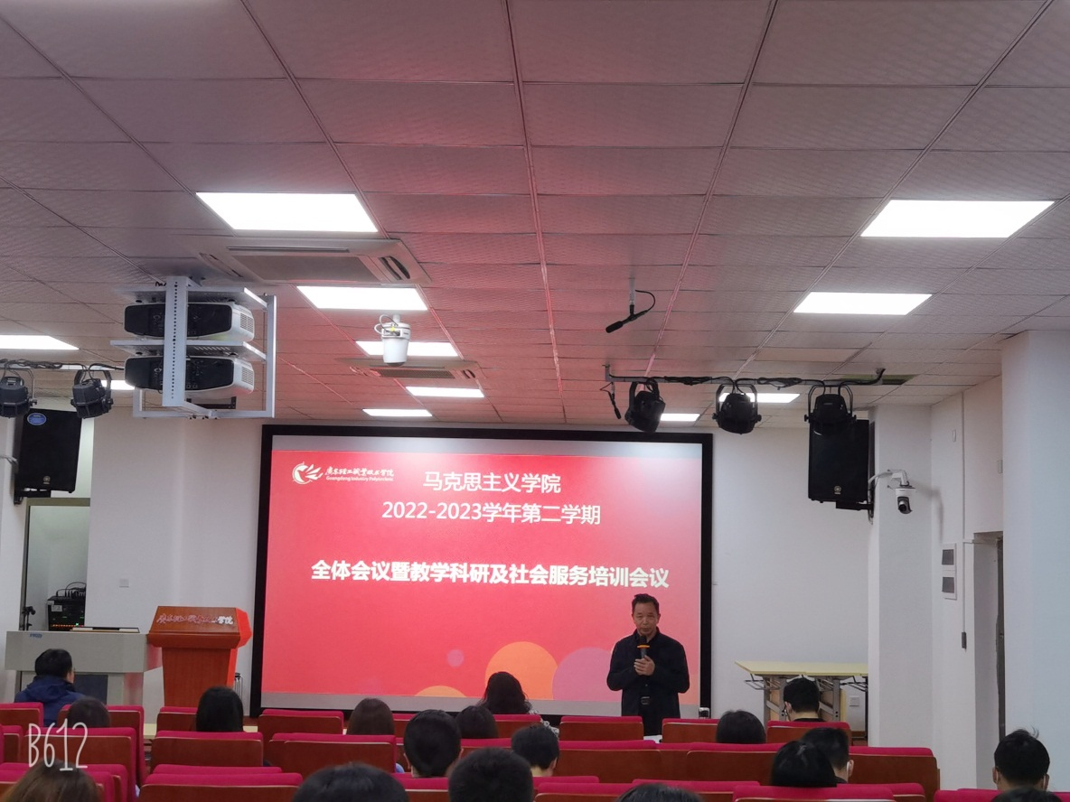 首先,储水江院长对去年一年的工作成绩做了一个简单的回顾,一是“概论”课慕课被评为国家级精品在线开放课程;二是“概论”和“德法”两门课程慕课被教育部国家高等教育智慧教育平台首批收入;三是立项教育部2022年度高校思政理论教师研究专项一般项目:“新时代红色家风融入高校思想政治理论课教学研究”1项;四是2019年度教育部高校示范性马克思主义学院和优秀教学科研团队建设重点项目结项;五是获评广东省教学成果一等奖1项:“高职思政课‘多维矩阵’教学模式创新与实践”等十九个方面取得的成绩进行了总结。并传达了学校新学期工作安排及学校即将开展的一系列改革,包括职称制度改革、绩效分配制度改革、教学质量提升及科研工作改革等。