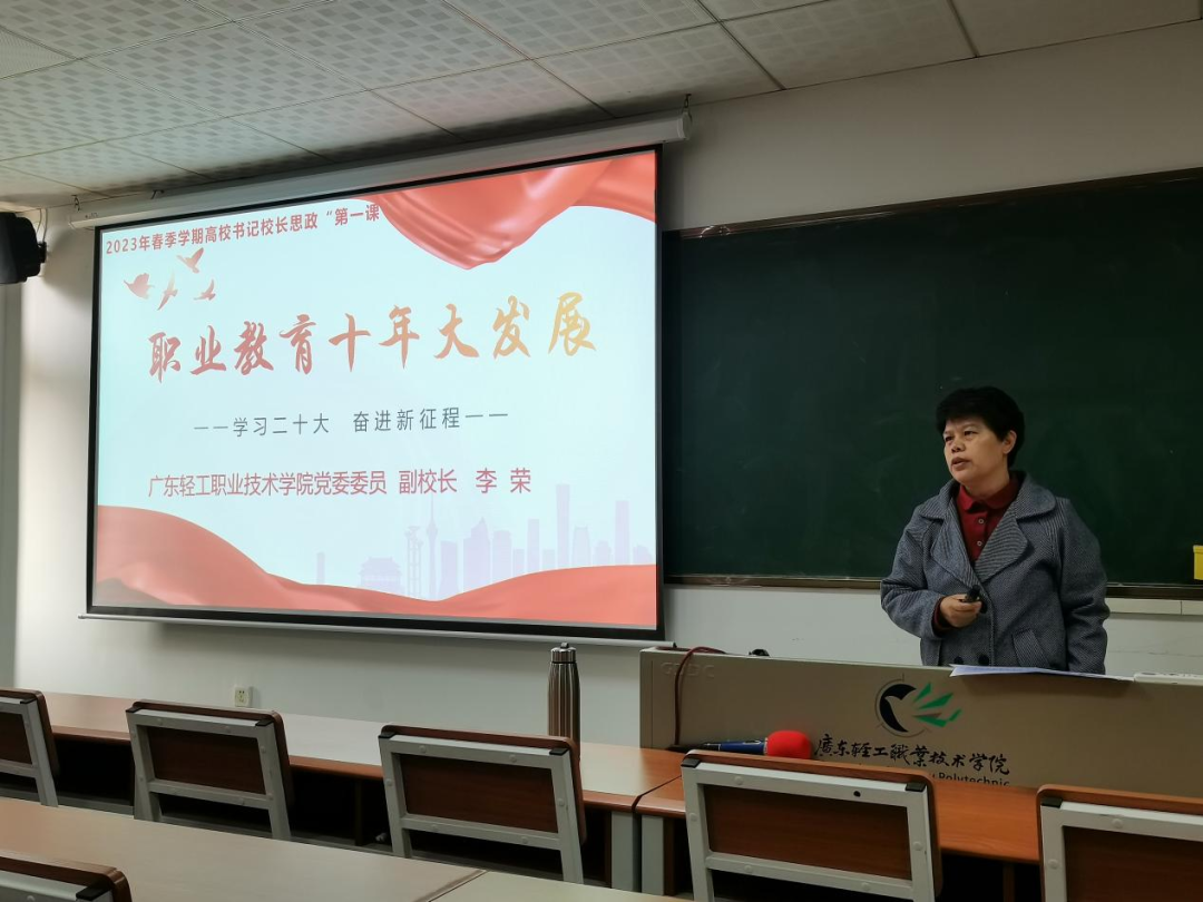2月27日上午,广东轻工职业技术学院党委委员、副校长李荣教授在南海校区南校区四号楼304教室,以“职业教育十年大发展——学习二的十大精神 奋进新征程”为题,为精化211和精化212班同学讲授“思政第一课”。