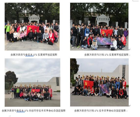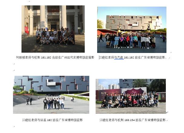 12--16周,余展洪、江晓红、何秋柳三位老师按照一个教学计划,共组织带领了10个班级共约300名学生分别到黄埔军校、辛亥革命纪念馆、广东省博物馆、广州近代史博物馆等地开展社会实践参观学习活动,切实加强对本、专科学生的爱国主义教育。