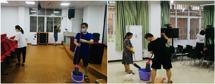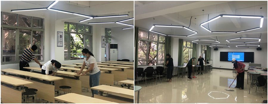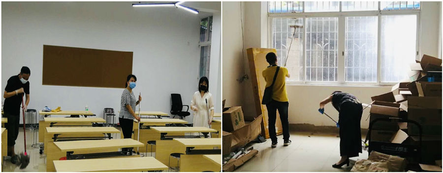 当天,全院所有无课的22位教师和行政人员分上午和下午2组返校,全面清洁了广州校区研练中心一层、二层共约1400平方米的研练教室、工作室、长廊等地。老师们保持距离、埋头清理、有条不紊,虽然防护装备仅为口罩,但也阻挡不了抗击疫情、守护研练中心公共卫生安全的热情和姿态。