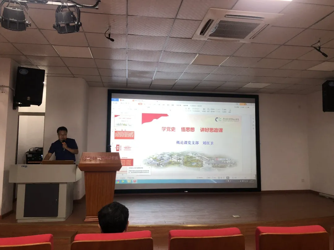 学习活动开始前,全体教师党员提前学习《中国共产党简史》。会上,三个党支部书记依次进行学习分享。形势与政策课党支部书记黄志敏重点阐述了中国特色社会主义的科学内涵;基础课党支部书记丁玲以“学习党史 践行使命”为题,梳理中国共产党历史发展的四个时期,回顾党的百年发展历程,总结历史经验,作为思政老师要坚定理想信念,践行立德树人使命;概论课党支部书记刘红卫以“学党史 悟思想 讲好思政课”为题,从历史、理论和实践逻辑阐述百年党史是一部在自我革命中实现超越和发展的奋斗史,重点讲解学习百年党史对讲好思政课的重要启示。