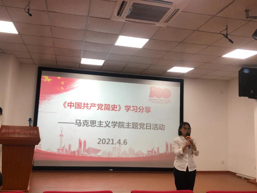 4月6日下午,马克思主义学院在第一实训楼105报告厅开展了《中国共产党简史》学习分享主题党日活动。三名党支部书记围绕党史学习教育教育主题,依次分享学习体会。会议由主持党总支工作的副书记余展洪主持,全体教职工参加了会议。