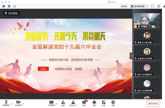 4月20日晚,由马克思主义学院党总支、党委宣传部主办,学校团委、党委学生工作处等部门协办的“粤”讲党“粤”爱党—2022春季学期学习党的十九届六中全会精神宣讲第五场顺利举行。第五场宣讲活动主讲人为马克思主义学院宋晓亚老师。因为疫情防控需要,她通过腾讯会议为我校社团学生宣讲党的十九届六中全会精神。本次宣讲会共有288位社团学生骨干参与。