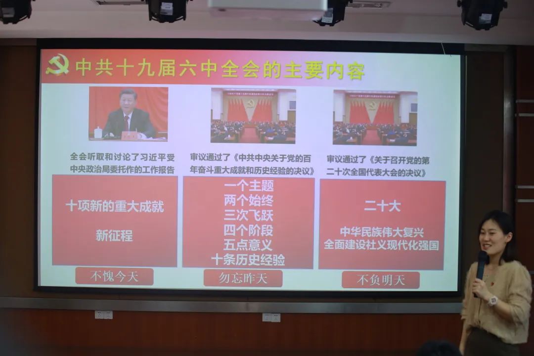 赵老师从党的十九届六中全会的基本概况、党的十九届六中全会公报全文解读、党的十九届六中全会的意义、争做有志气、有骨气、有底气的新时代学生四个方面进行宣讲。她简单介绍了党的十九届六中全会召开的背景,使同学们认识到党的十九届六中全会是在中国共产党成立一百周年的重要时刻,是完成第一个百年奋斗目标,向第二个百年奋斗目标挺进的历史交汇关键节点召开的一次具有重大历史意义的会议;接着,赵老师重点宣讲了党的十九届六中全会审议通过的《中共中央关于党的百年奋斗重大成就和历史经验的决议》,分别从“一个主题”、“两个始终”、“三次飞跃”、“四个阶段”、“五点意义”、“十条经验”等方面分析党的百年奋斗重大成就和历史经验,明确了党未来工作的要求:不忘初心,方得始终!使同学们掌握“过去我们为什么能够成功”和“未来我们怎样才能继续成功”,从而更加坚定、更加自觉地“听党话、跟党走”!