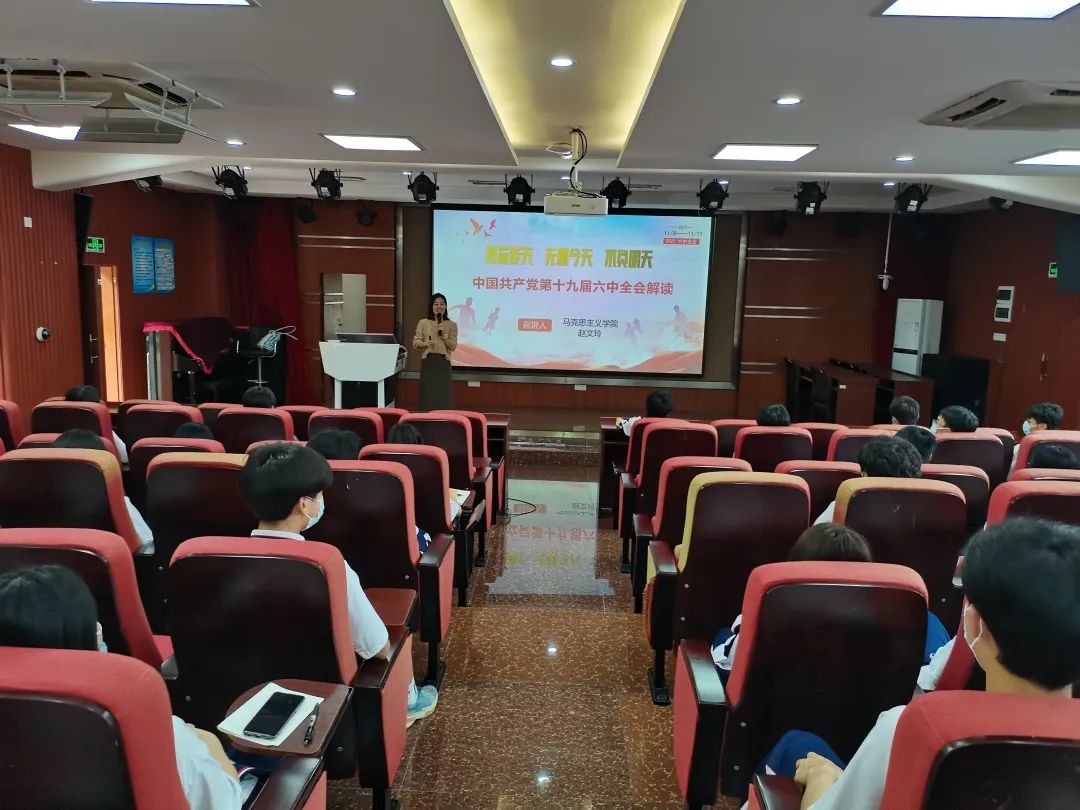 4月28日下午,由马克思主义学院党总支、党委宣传部主办,学校团委、党委学生工作处等部门协办的“粤”讲党“粤”爱党—2022春季学期学习党的十九届六中全会精神宣讲第九场顺利举行。马克思主义学院赵文玲老师在琶洲校区学术报告厅,与近百位中职学生干部和社团骨干一起学习领会党的十九届六中全会精神。