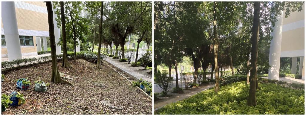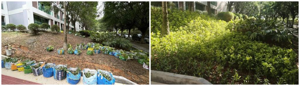 了解清楚种植要求后,老师们在各党支部的组织带领下,在花农师傅们的悉心指引下,放下手机、撸起袖子,如火如荼大干起来,大家拿起铁锹、锄头等工具忙碌而有序地挖坑铲土、放苗扶正、填土定植,不怕脏、不怕累,干劲十足,场面热火朝天。在大家的辛勤劳动下,新栽种的鸭脚木、翠萝莉、三角梅迎风挺立。