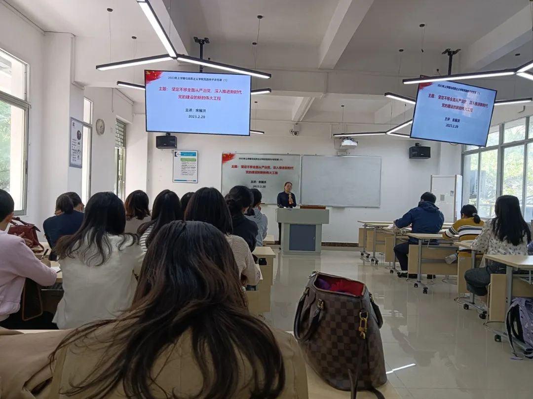 会上,余展洪首先带领大家进行“第一议题”学习:学习党的二十大精神。她结合党的二十大报告第十五部分,以“坚定不移全面从严治党,深入推进新时代党的建设的新的伟大工程”为主题,着重从坚持和加强党中央集中统一领导、坚持不懈用习近平新时代中国特色社会主义思想凝心铸魂、完善党的自我革命制度规范体系、建设堪当民族复兴重任的高素质干部队伍等七个方面讲授微党课,并结合学院党建实际,强调要用习近平新时代中国特色社会主义思想统一思想、统一意志、统一行动,会上对去年我院11位党员教师志愿参与学校抗疫工作给予褒扬,强调今后教学、科研与社会服务工作过程中加强党的二十大精神学习贯彻和落实工作的深远意义。