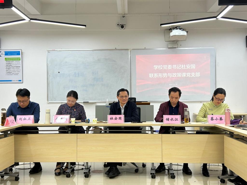 11月14日下午,学校党委书记杜安国同志2023年秋季学期联系形势与政策课党支部、联系思政课教师座谈会顺利举行。我院院长储水江、党总支负责人余展洪、副院长蔡小葵、副院长刘红卫、形势与政策课党支部全体党员教师以及思政课教师晋利、王浩、郭新志、高雅、余芳、赵文玲、王婉雯等老师参加座谈。