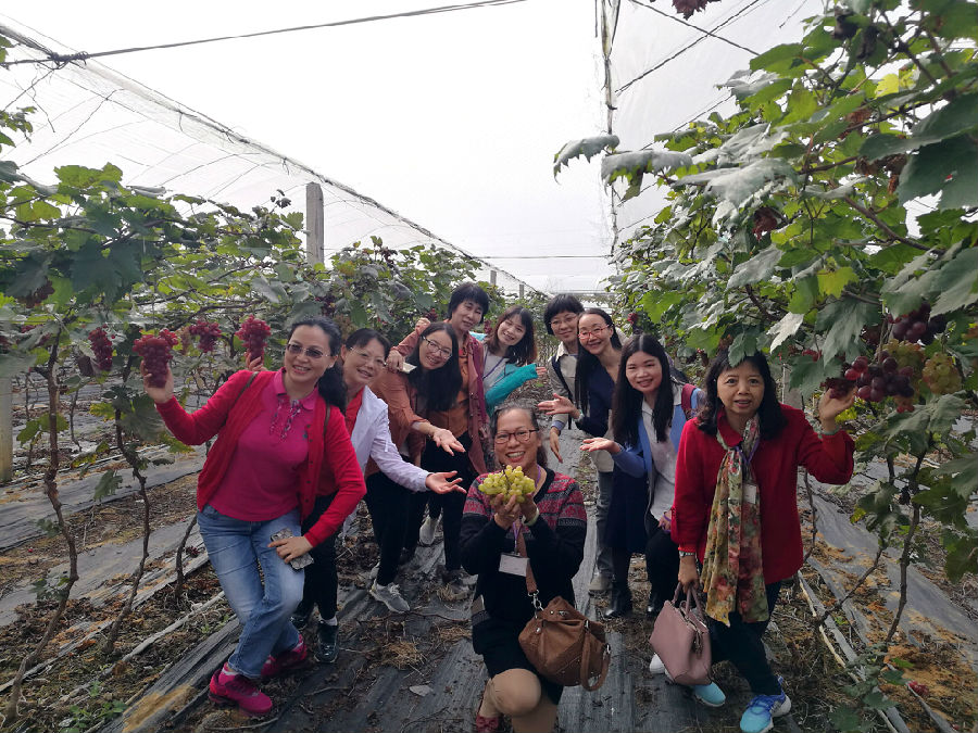 为舒缓教职工工作压力,丰富教职工业余文化生活,提升教职工幸福指数,11月24日,马克思主义学院顺利组织清远果园、小北江考察及古龙峡登山活动,通过此活动,颐养身心、增进友谊、加强沟通、促进合作,为学院进一步快速发展积蓄能量。(文:黄姗姗编审:余展洪) (图1:参加工会活动教师合影) (图2 :女教师们在葡萄园中合影)