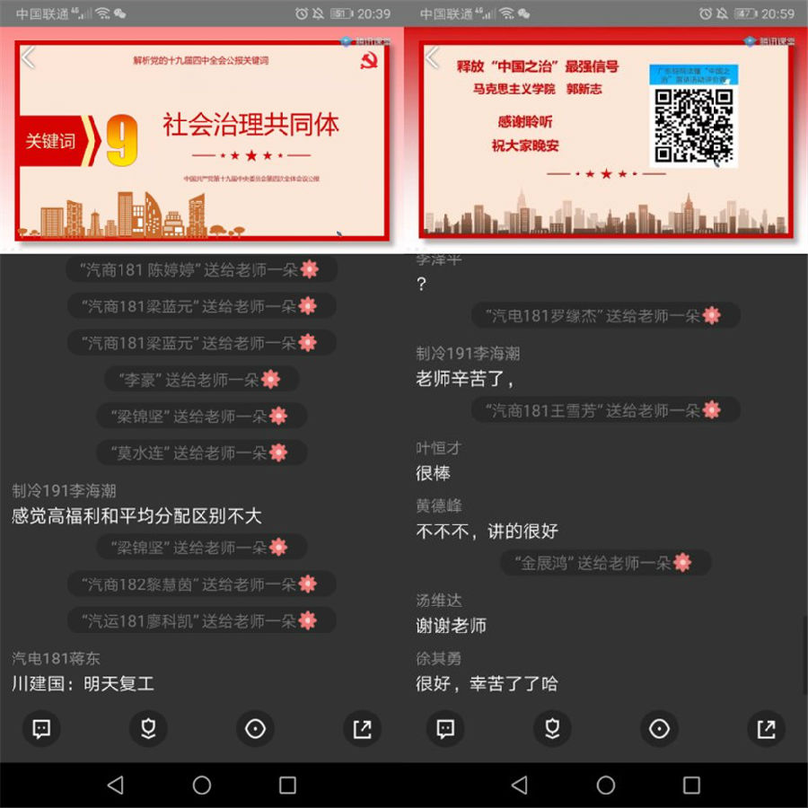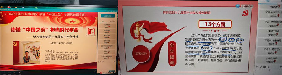本学期宣讲活动由马克思主义学院党总支承办,副书记余展洪教授携20位思政课专任老师以线上直播或录播方式共开展宣讲,做到全校10所二级学院全覆盖。从本月24日起共宣讲25场,截至2020年4月28日,已完成10场宣讲活动,来自艺术设计学院、信息学院等二级学院4000余名学生聆听了讲座。目前学生好评率超过98%。其中,艺术设计学院广告192的洪培基同学在听完王浩副教授的宣讲后说:“老师讲的课很到位,平时我不怎么爱听历史。但这次听了王浩老师讲的让我热血沸腾,想马上为祖国做出奉献的感觉!”轻化工技术学院高分子193蔡锦洪同学听完陈爱华老师课后说:”听了这次讲座,我更加直观的认识到我们国家的强大,也明白了西方国家和我们国家法制上的根本区别,更加坚定了跟党走的信念。”艺术设计学院服装182严晓婷同学在听完胡冰副教授的课后说:“一要充分认识我国国家制度和治理体系的显著优势,坚定不移走中国特色社会主义法治道路。二要强化责任担当,作为一名大学生,要有明辨是非的能力,肩负起自己该为社会承担的责任。三要发挥好关键少数作用,做尊崇法治的表率。坚持以人民为中心的发展思想。”