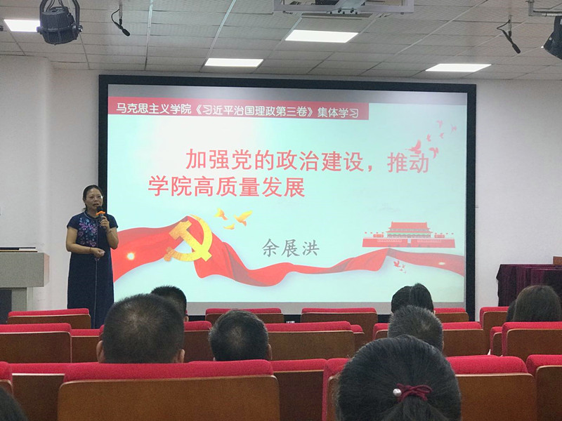 9月22日下午,我院在第一实训楼105室举行全体教职工学习活动,集中学习《习近平谈治国理政》第三卷,学院主持党总支工作副书记余展洪作了《加强党的政治建设,推动学院高质量发展》的专题报告。