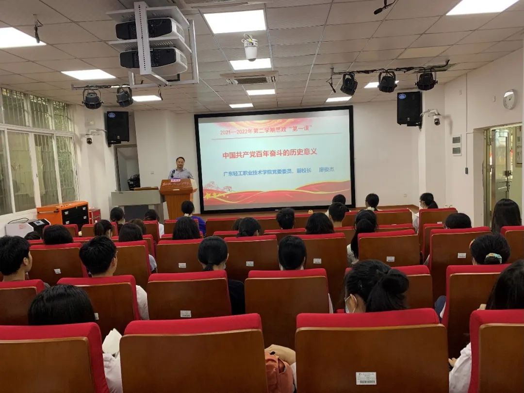 3月11日下午,在广州新港校区第一实训楼105教室,学校党委委员、副校长廖俊杰以“中国共产党百年奋斗的历史意义”为主题,为营销203班和注师201班同学讲授了新学期“思政第一课”。