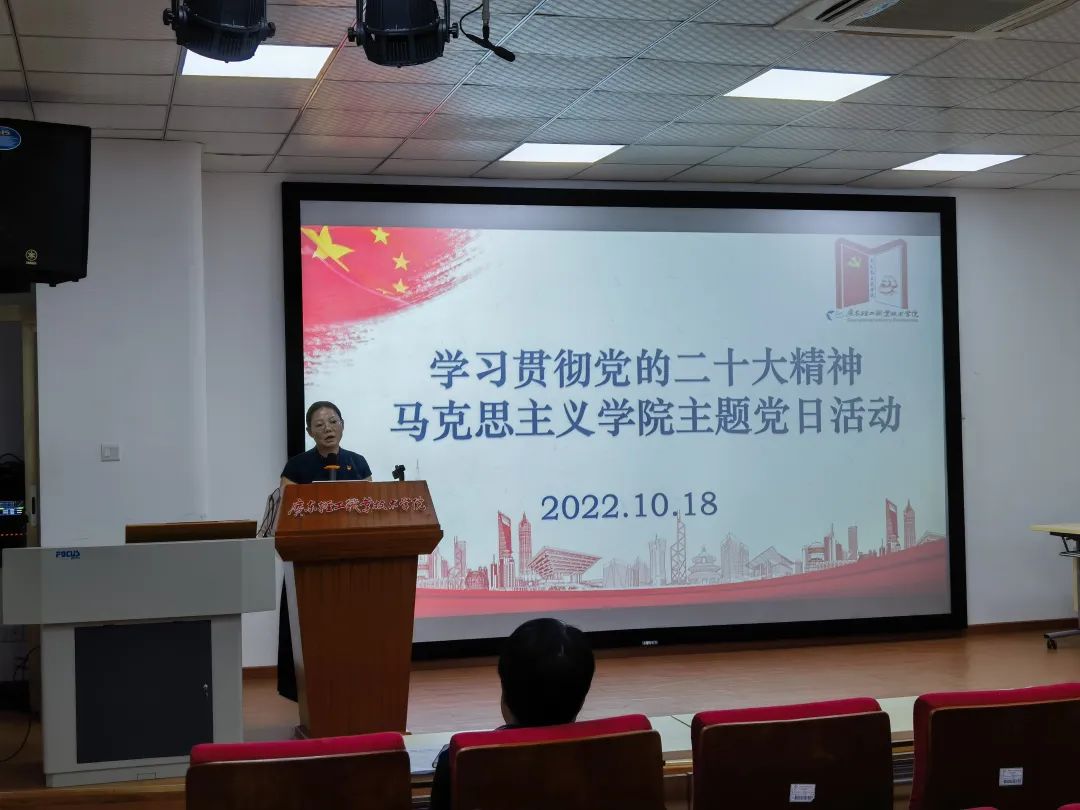 余展洪首先领学了党的二十大精神。她指出,党的二十大特别提到了要弘扬伟大建党精神,提出了要不断的勇毅前行,为全面推进中华民族伟大复兴而团结奋斗。强调我们伟大的国家,伟大的民族,伟大的人民,要做的伟大的事业,大家一定要团结一心才能够取得共同的胜利。她表示,思政课作为宣讲党的二十大精神的主渠道、主阵地,马院教师应更好地承担起这些光荣使命。她希望马院全体教师要认真地把党的二十大精神贯彻到思政课建设、马克思主义中国化研究中,更好地引领我们学院不断地创新发展。最后,余展洪指出,学习党的二十大精神要全面务实、提质增效,不但要做到进头脑,还有要进课堂,进研究领域,进宣讲。最后再次强调全体党员教师要严格落实疫情防控制度要求,严明学院会风会纪,遵守工作纪律、政治纪律和学习纪律。