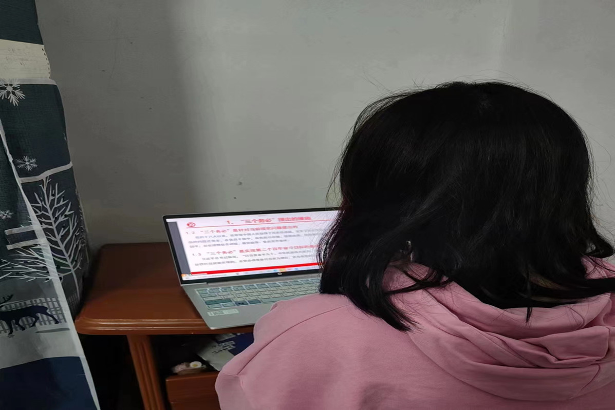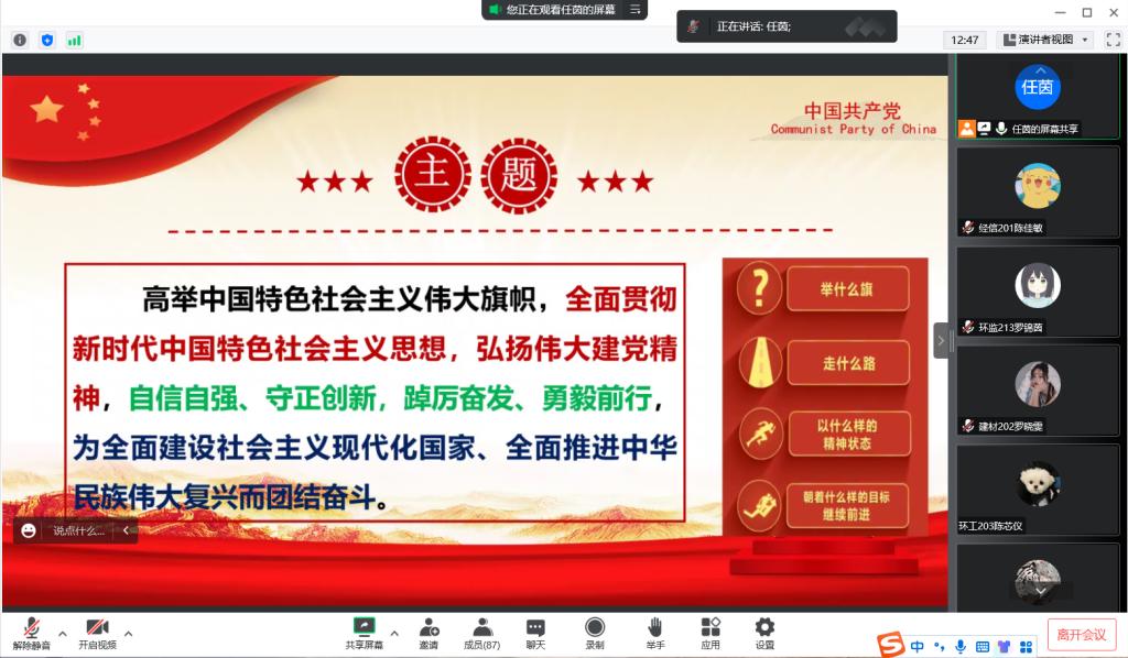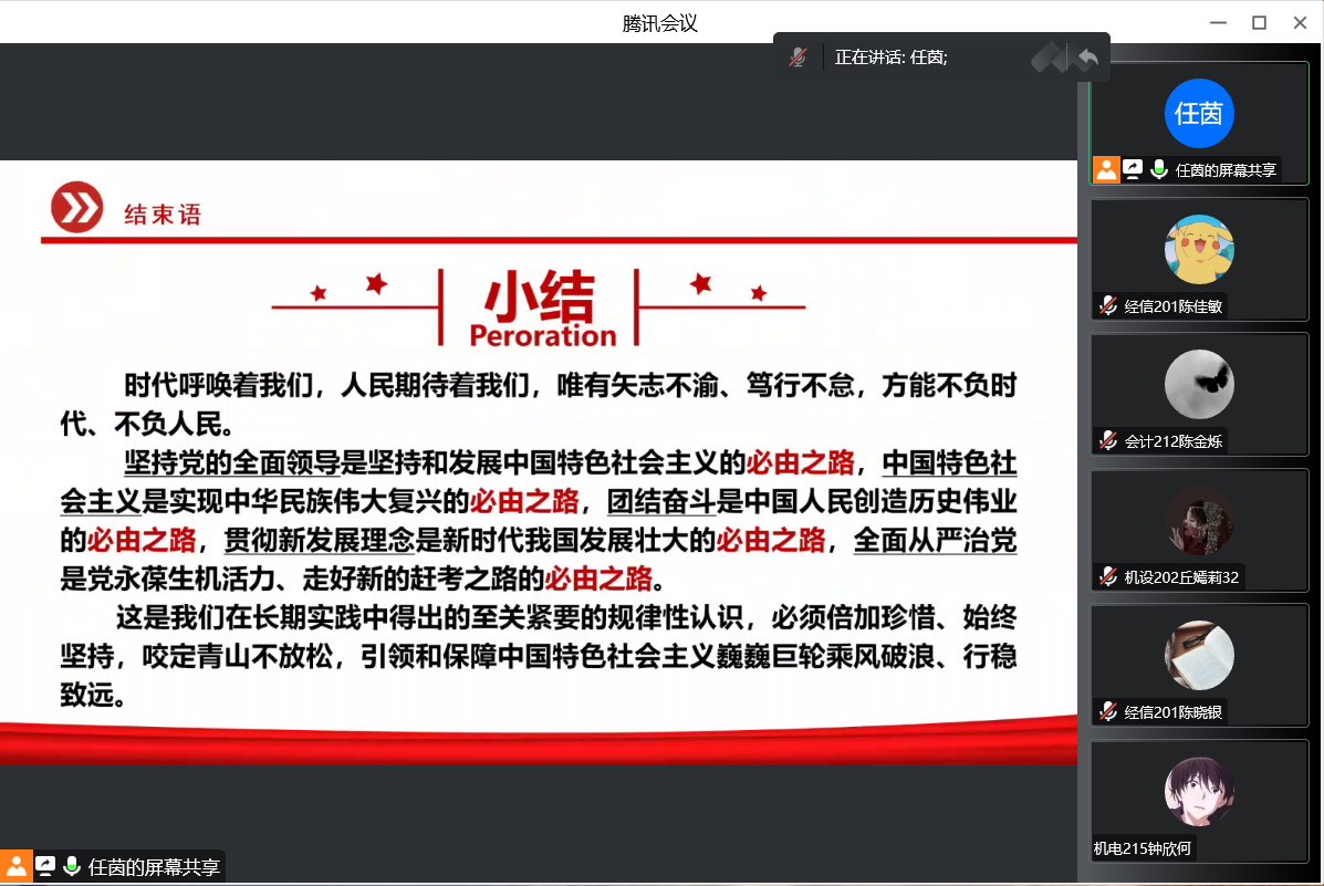 与会同学纷纷发表自己的学习感受,郭幸姿同学说:“当代中国青年生逢其时,施展才华的舞台无比广阔。青年大学生要勇做时代的追梦人,要以实现中华民族伟大复兴为己任,树立强烈的历史使命感和责任感,善于学习知识和更新知识,疫情之下,在家上网课,更应该努力学习,脚踏实地,志存高远”。