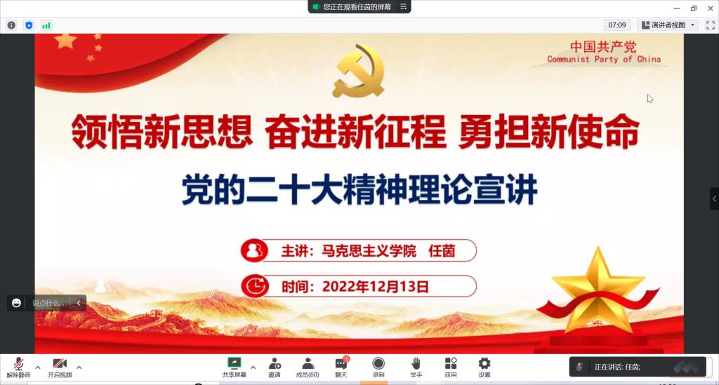 12月13日晚,由党委宣传部、马克思主义学院党总支、校团委主办,概论课党支部、马克思主义协会、习近平新时代中国特色社会主义思想研究协会、红色经典研学协会、国学协会等协办的党的二十大精神宣讲学生专场第二场顺利开讲,宣讲活动主讲人为红色经典研究协会指导老师任茵。协会全体同学参加了宣讲活动。
