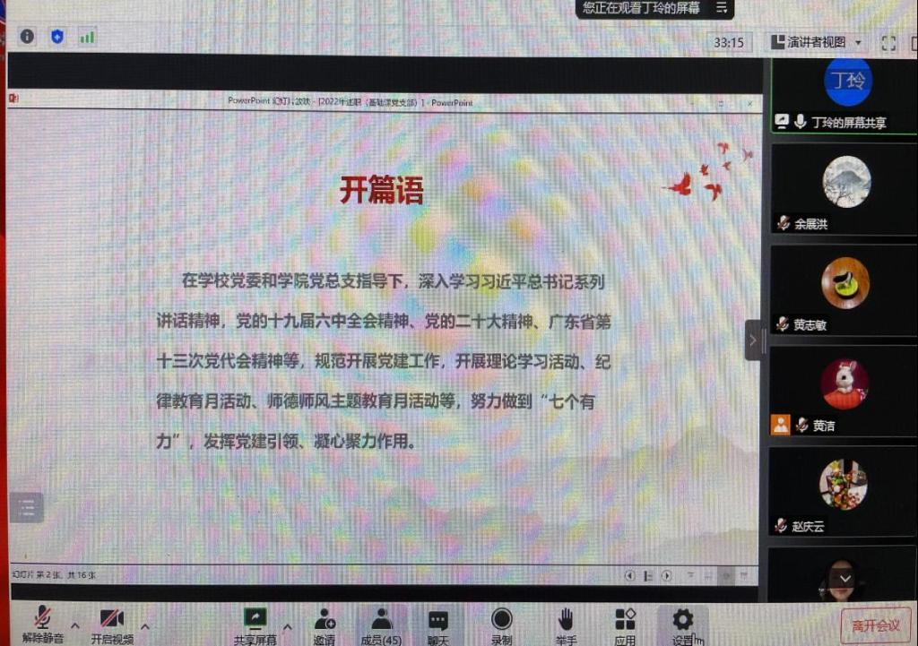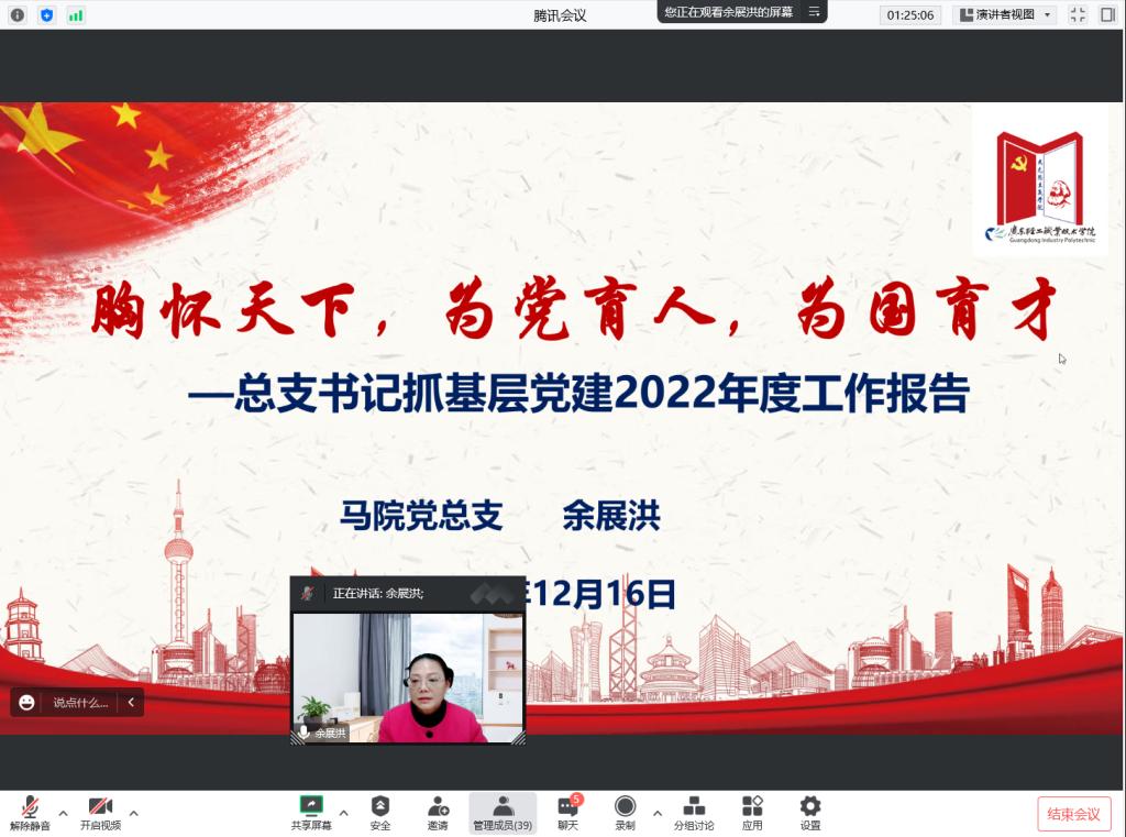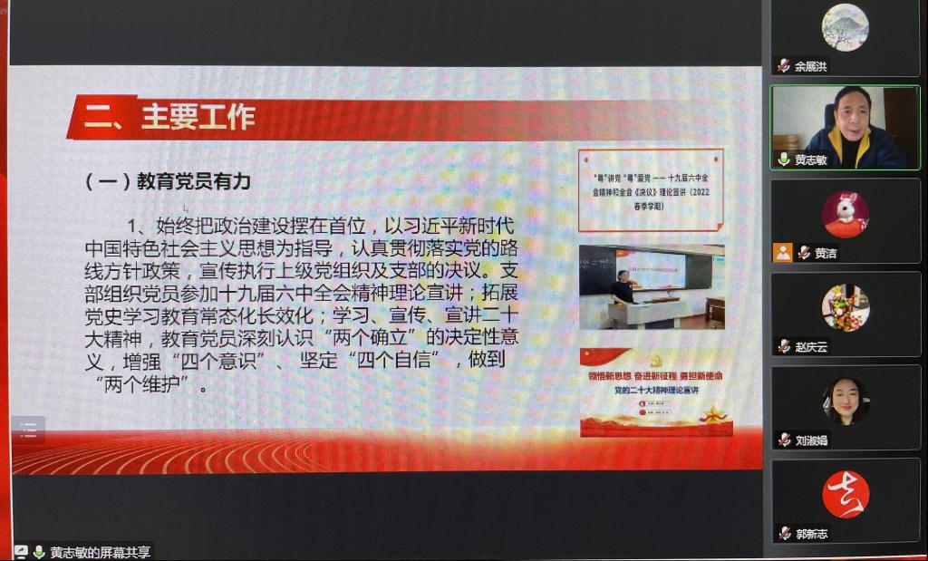 12月16日下午,马克思主义学院党总支通过腾讯会议召开2022 年度党支部书记述职考评会议。党总支委员、党支部委员及党员教师等45人出席了会议,会议由主持工作的党总支副书记余展洪主持。