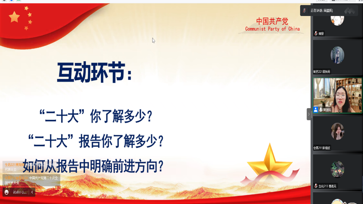 周晨阳老师从党的二十大基本情况、党的二十大报告中的新观点新论断新思想、当代大学生勇担新使命三个方面进行了详细的解读,重点从历史性成就与伟大变革、马克思主义中国化时代化、中国式现代化等多个方面,带领同学们深入理解党的二十大精神理论。她不断勉励同学们,要从党的二十大报告中明确自己的前进方向,勇担强国一代的历史使命。