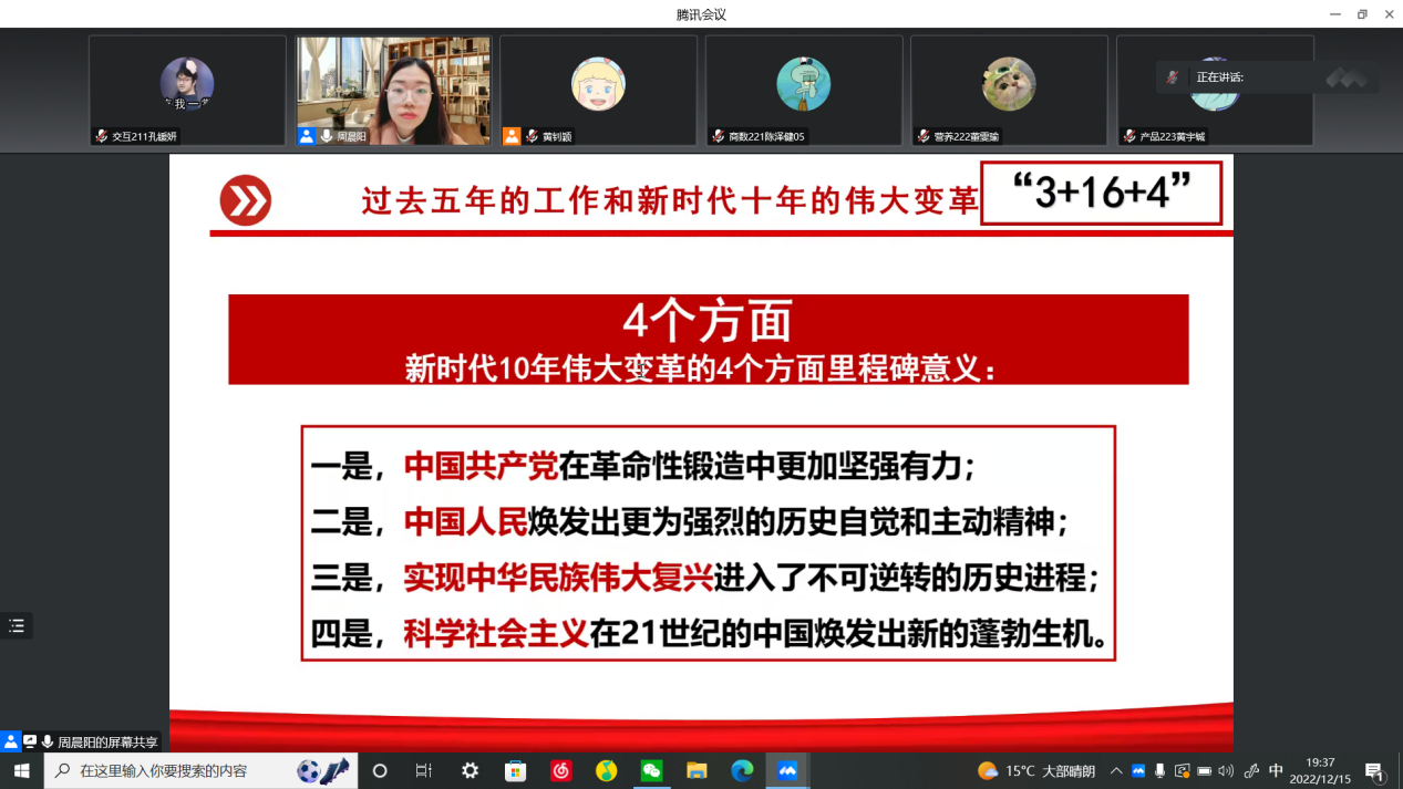 12月15日晚,由党委宣传部、马克思主义学院党总支、校团委主办,概论课党支部、马克思主义协会、习近平新时代中国特色社会主义思想研究协会、红色经典研学协会、国学协会等协办的党的二十大精神宣讲学生专场继续进行。第七场宣讲活动主讲人为马克思主义学院周晨阳老师,她通过腾讯会议为我校学生骨干宣讲党的二十大精神。本次宣讲会共有近300位学生参与。