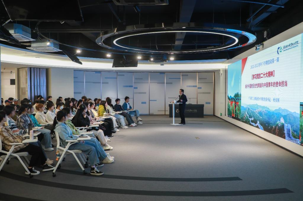 当今世界正处于物质文化高度发达,科学技术迅速发展的时代,每一个中国青年都要牢记历史、认清现实,在中华民族伟大复兴的新征程中贡献自己的力量。杜书记有理有据的分析、声情并茂的演讲深深地感染了每一位同学,课后同学们报以热烈的掌声,并纷纷表示作为新时代的青年,要深刻领会党的二十大精神,在中国式现代化的道路上立大志、明大德、成大才、担大任。