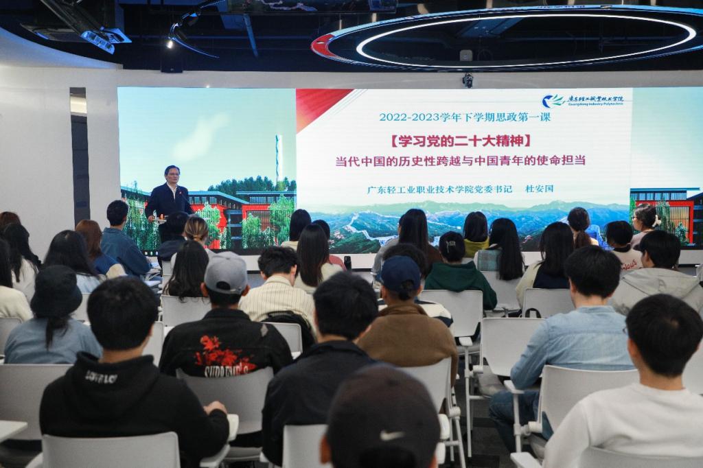 3月1日上午,广东轻工职业技术学院党委书记杜安国在广州新港校区第二工业实训楼二楼校史馆,以“学习党的二十大精神:当代中国的历史性跨越与中国青年的使命担当”为题,为电商211、电商212班将近一百位学生讲授“思政第一课”。