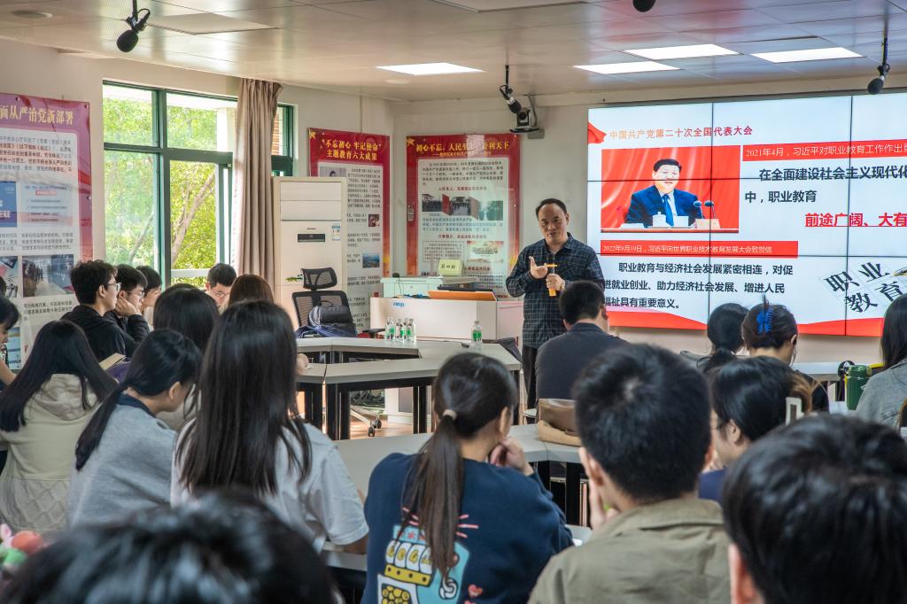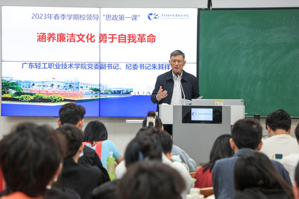 3月8日上午,广东轻工职业技术学院党委副书记、纪委书记朱其祥以“涵养廉洁文化 勇于自我革命”为题,为艺术设计学院展示211和212班同学讲授“思政第一课”。朱其祥紧密结合党的二十大精神,系统讲解了新时代廉洁文化的内涵,新时代反腐败斗争的历史成就,加强大学生廉洁文化教育的重大意义以及如何加强新时代大学生廉洁文化教育。并对同学们提出殷切希望。3月9日上午,广东轻工职业技术学院副校长廖俊杰以“职业教育十年大发展——学习党的二十大精神奋进新征程”为主题,为高分子213班和造纸212、造纸212班的同学讲授新学期“思政第一课”。廖俊杰围绕党的二十大报告中关于职业教育板块的内容进行了全面深刻的阐述和形象生动的解读。介绍了全球职业教育发展视域下世界职业教育发展现状,对我国职业教育近十年发展所取得的成果进行了总结,对职业教育的发展未来进行了展望,激励同学们练就过硬本领,勇担时代重任,为中华民族伟大复兴贡献自己的力量。2月27日上午,广东轻工职业技术学院副校长李荣以“职业教育十年大发展——学习党的二十大精神奋进新征程”为题,为精化211、212班同学讲授“思政第一课”。李荣围绕党的二十大精神,深刻解读“过去五年的工作和新时代十年的伟大变革”,向同学们介绍了党的十八大以来,职业教育实现新的历史跨越,吸引力、影响力、竞争力不断增强,结合精化专业发展与学生个人发展,讲述了职业教育发展面临的大好机遇,让同学们对所学专业充满信心,对广轻未来发展充满期待。