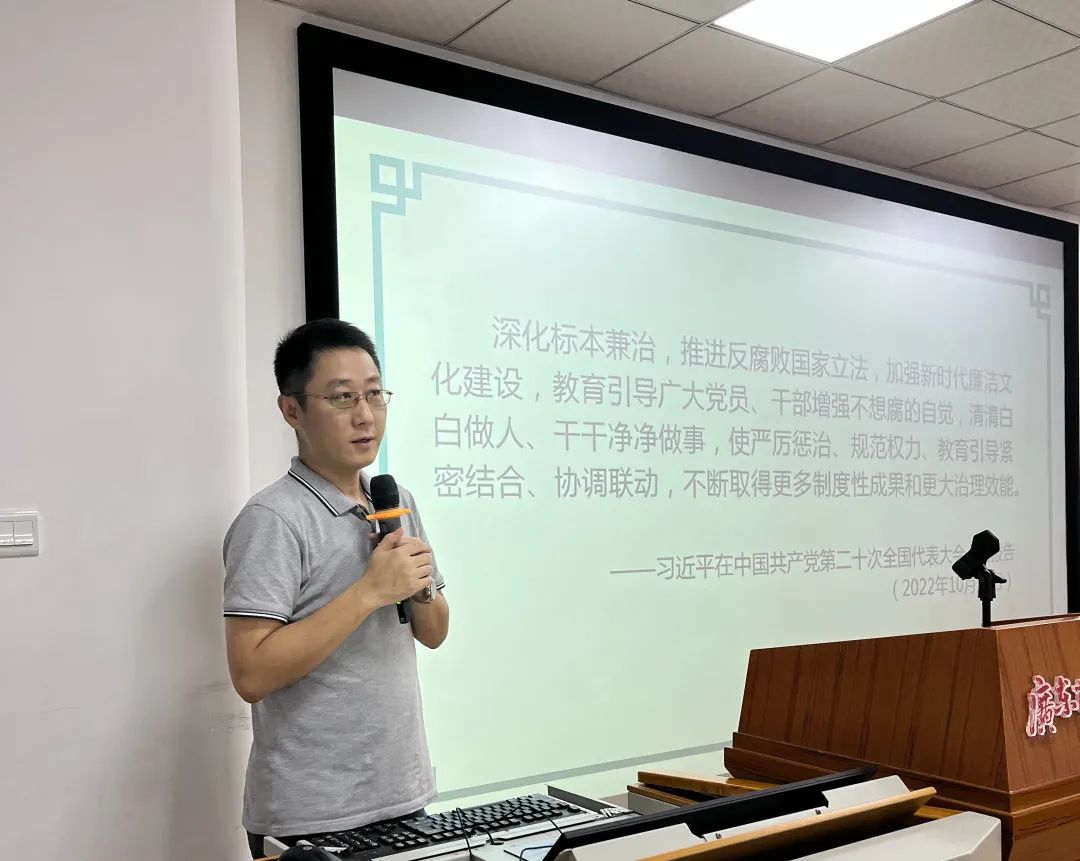 我院张浒老师代表党总支讲授廉洁教育党课,主题为《以学正风,永葆清正廉洁》。首先,他回顾了我党从早期纪律建设的探索实践的历史中汲取的智慧和经验;接着,从加强新时代廉洁文化建设的重大意义;最后,从中国共产党廉洁文化建设的探索与实践,加强新时代高校廉洁文化建设的基本要求三方面进行了讲述,指出思政课教师不仅要以党员的标准严格要求自己,还应提高政治站位,牢记立德树人根本任务。他强调,廉洁从教是师德之本。习近平总书记在党的二十大报告中指出,“在加快推进教育现代化的新征程中培养担当民族复兴大任的时代新人”。高校肩负着坚持为党育人、为国育才的神圣使命,是新时代推进廉洁教育的中流砥柱,是涵养风清气正的校园政治生态的重要一环。在宣讲过程中,张老师引用了教育部2023年公开曝光的违反教师职业行为十项准则的4个典型案例进行警示教育。