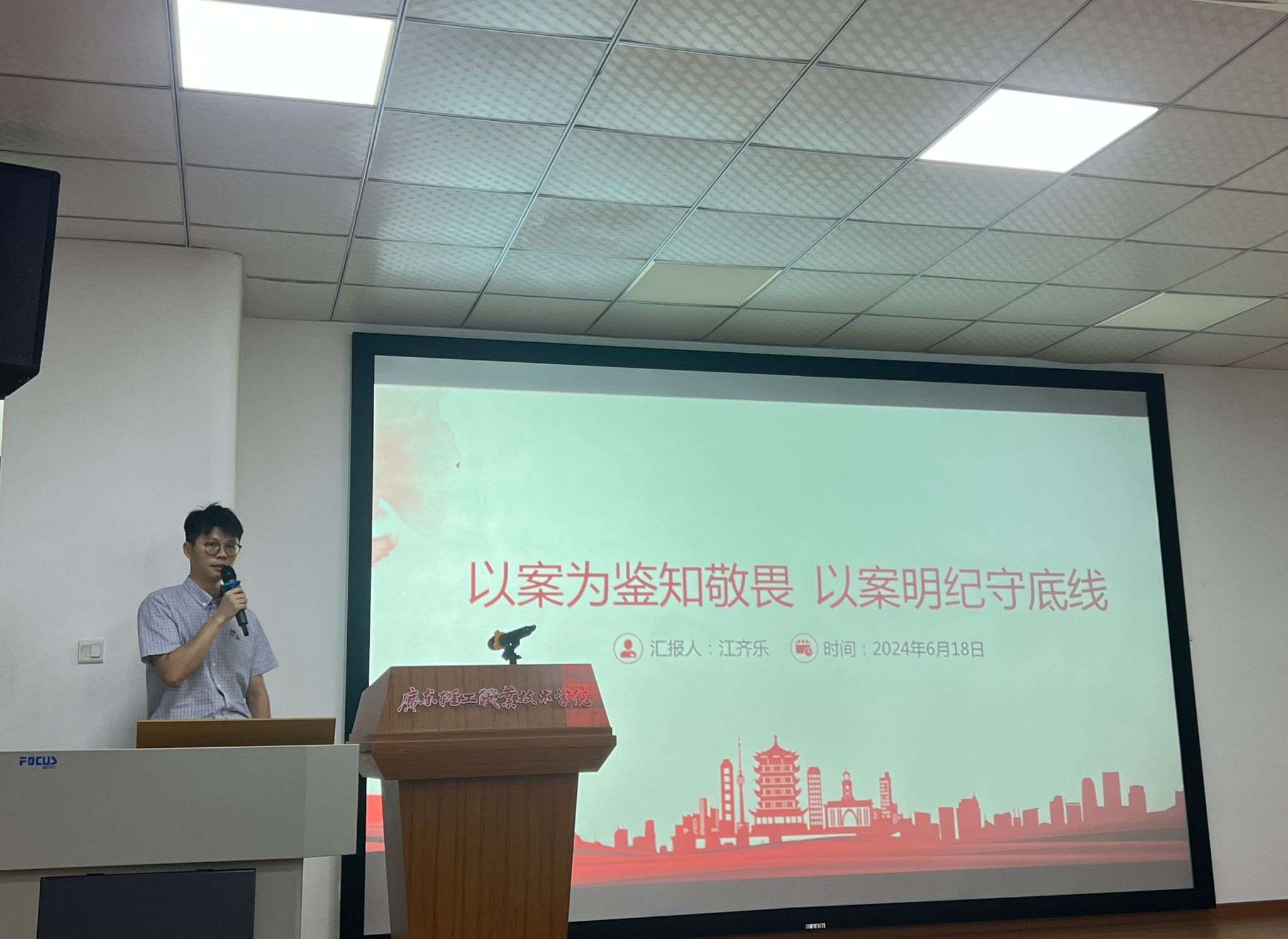 随后,学院党政办主任江齐乐围绕“以案为鉴知敬畏 以案明纪守底线”的主题进行案例讲解。他聚焦不当言论、不正当师生关系、学术不端及违规套取科研经费等高校典型风险问题,通过剖析真实案例,为全体教职工敲响警钟。