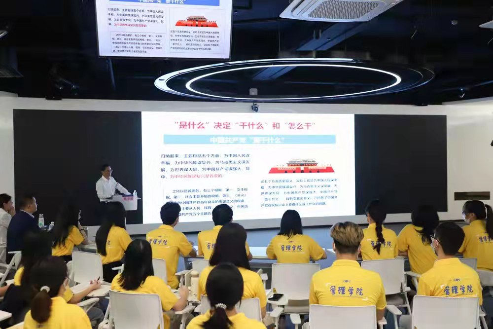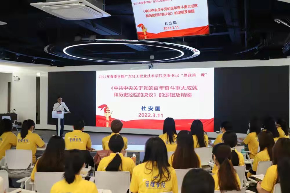 3月11日下午,学校党委书记杜安国在广州校区第二实训楼校史馆,以《中共中央关于党的百年奋斗重大成就和历史经验的决议》的逻辑及精髓为主题,为管理学院酒管203班和会展203班的同学们讲授了2022年春季学期“思政第一课”。